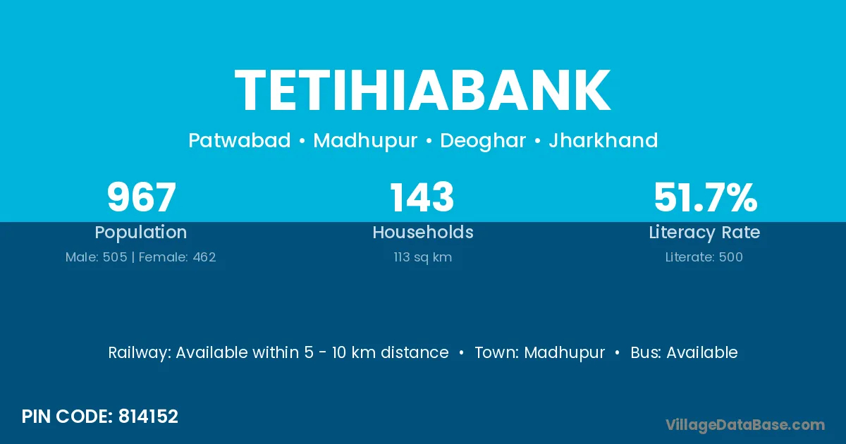 Tetihiabank village has a total population of 967 people, of which 505 are males and 462 are females.