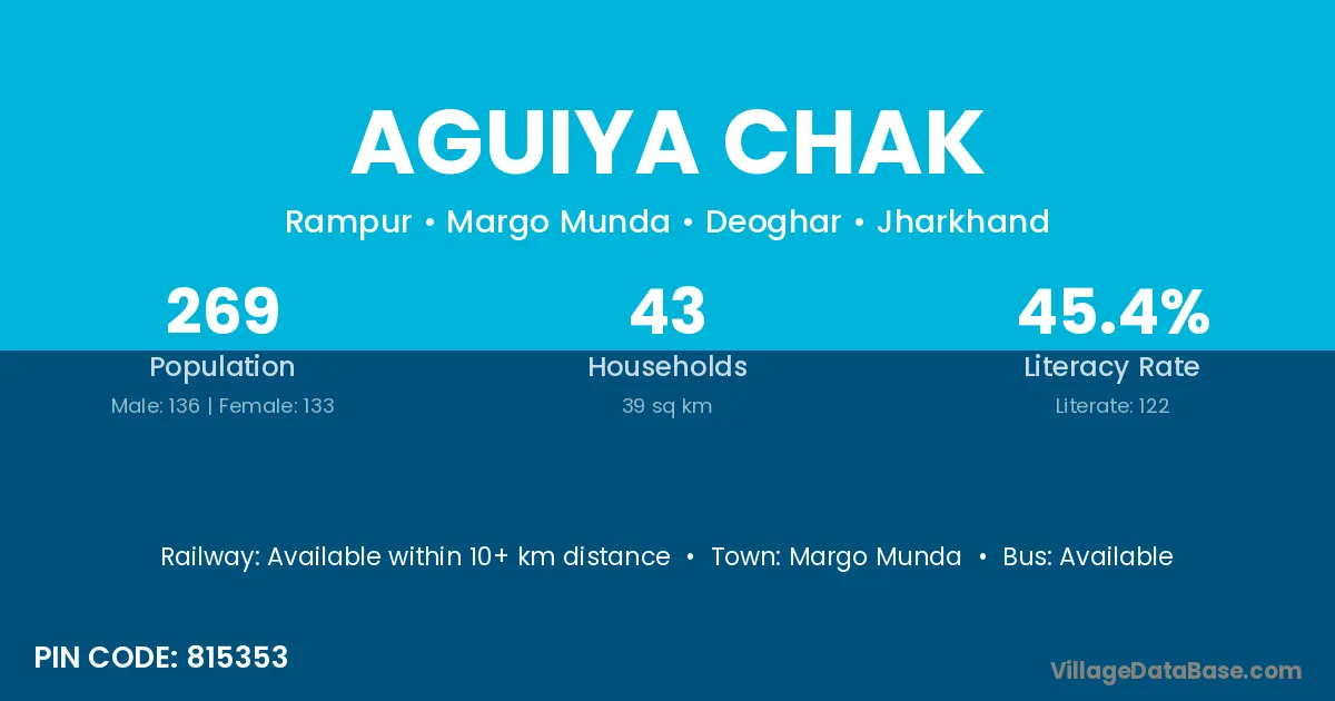 Aguiya Chak village has a total population of 269 people, of which 136 are males and 133 are females.