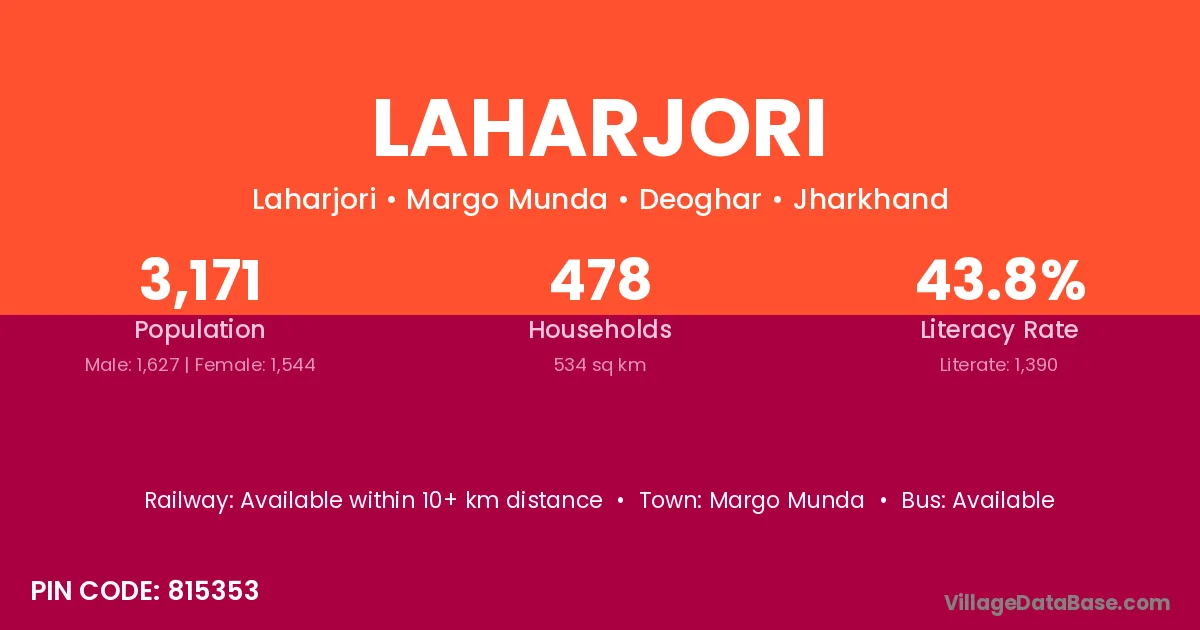 Laharjori village has a total population of 3,171 people, of which 1,627 are males and 1,544 are females.