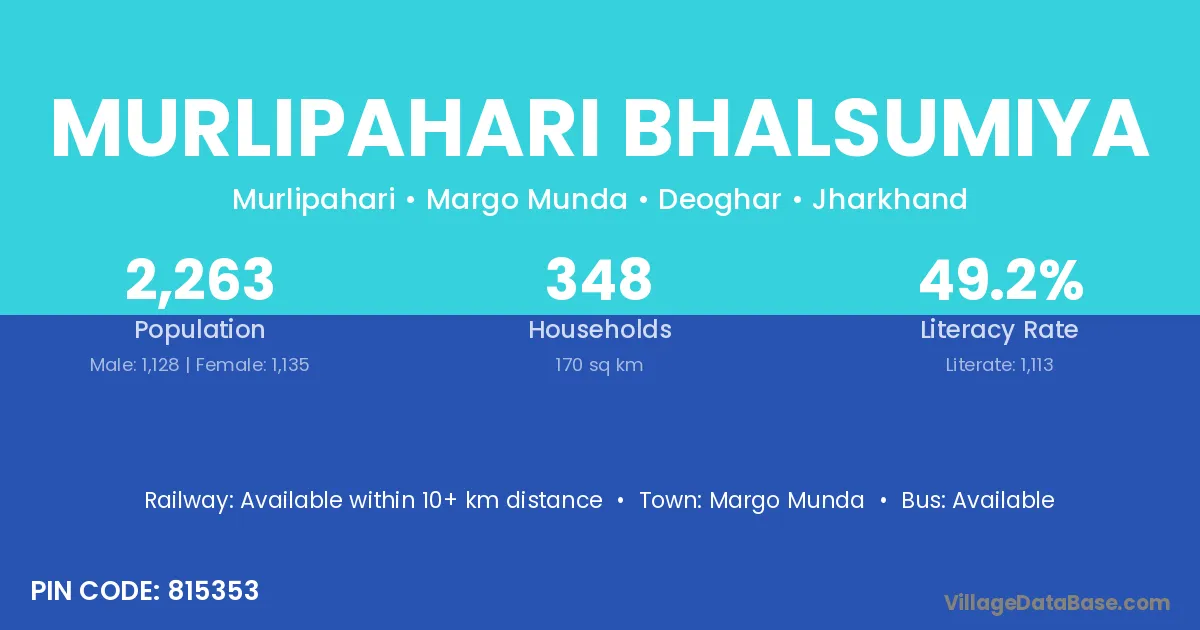 Murlipahari Bhalsumiya village has a total population of 2,263 people, of which 1,128 are males and 1,135 are females.