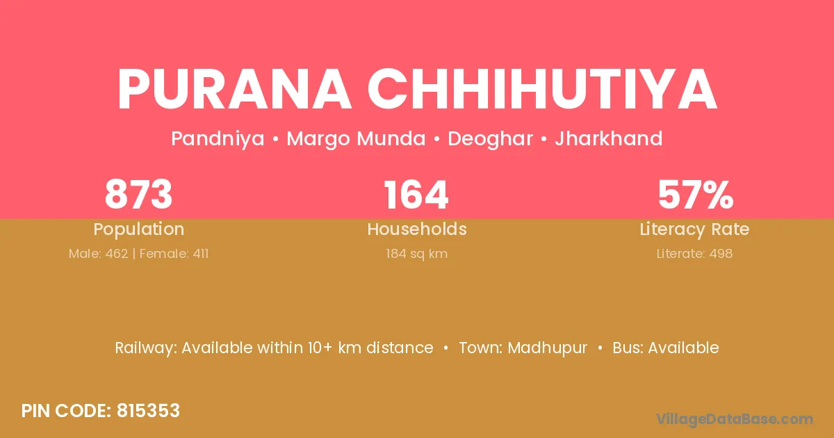 Purana Chhihutiya village has a total population of 873 people, of which 462 are males and 411 are females.