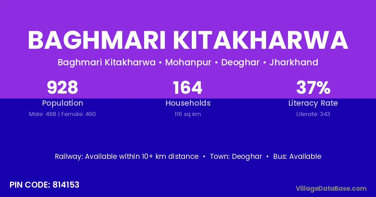 Baghmari Kitakharwa village has a total population of 928 people, of which 468 are males and 460 are females.