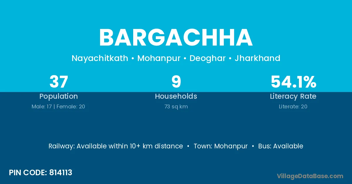 Bargachha village has a total population of 37 people, of which 17 are males and 20 are females.