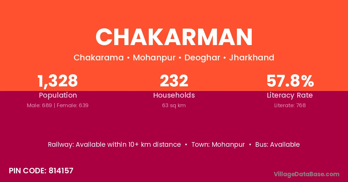 Chakarman village has a total population of 1,328 people, of which 689 are males and 639 are females.
