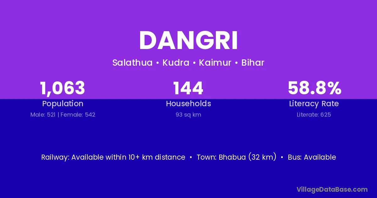 The literacy rate of Dangri village is 28.00%. Male literacy stands at 32.99% and female literacy at 22.65%.
