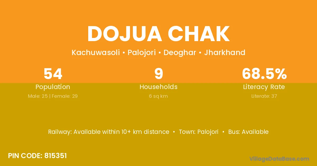 Dojua Chak village has a total population of 54 people, of which 25 are males and 29 are females.
