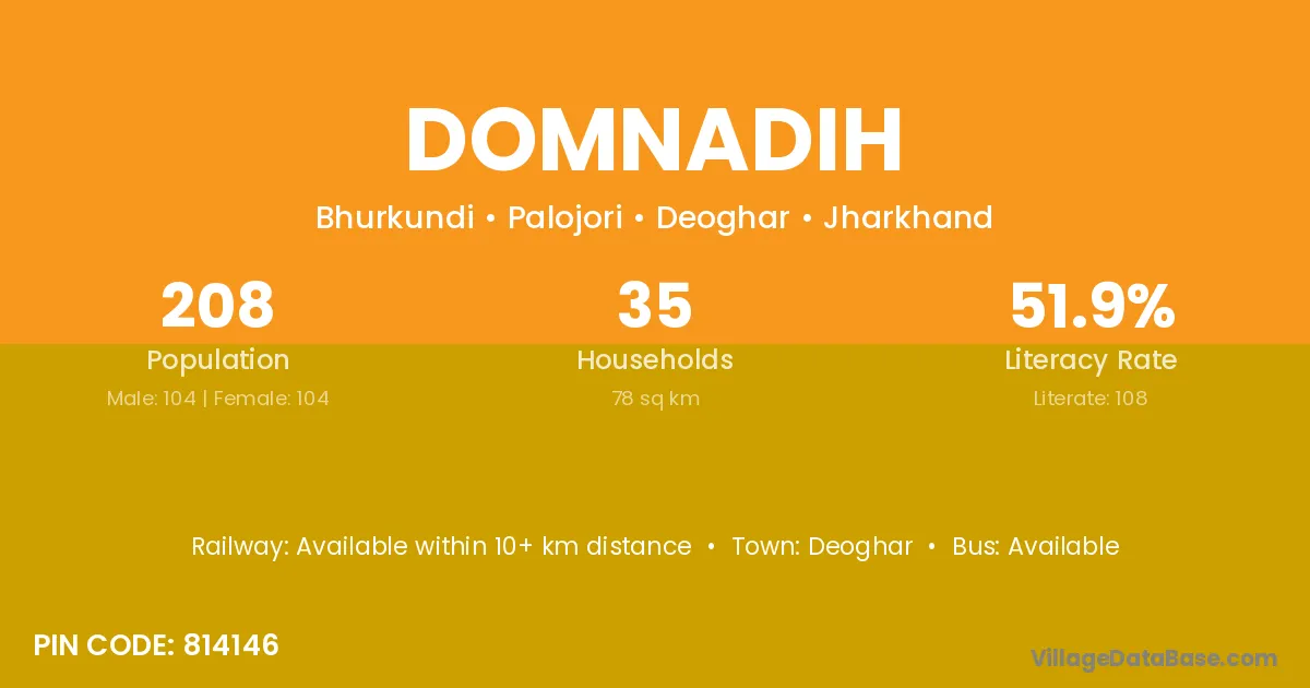 Domnadih village has a total population of 208 people, of which 104 are males and 104 are females.