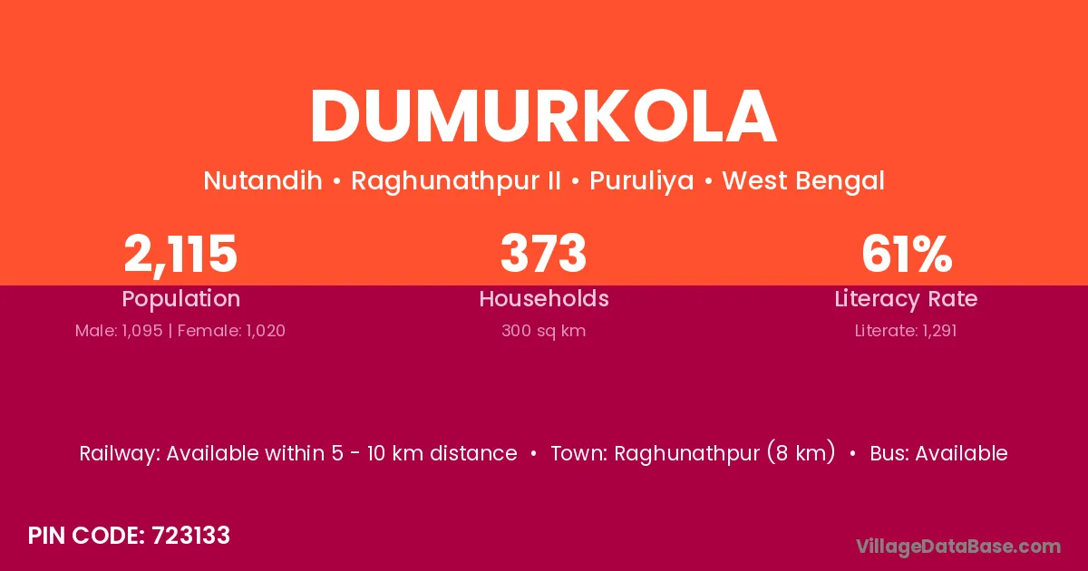 The literacy rate of Dumurkola village is 55.17%. Male literacy stands at 63.84% and female literacy at 45.08%.