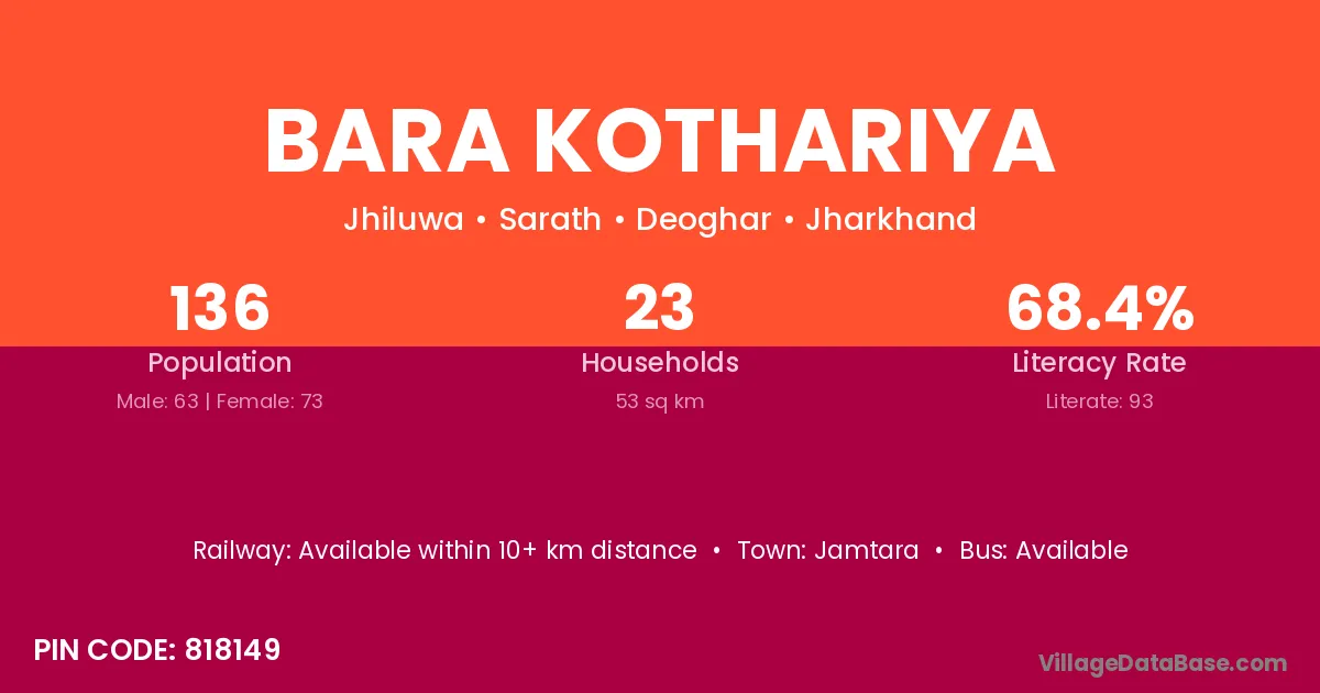 Bara Kothariya village has a total population of 136 people, of which 63 are males and 73 are females.