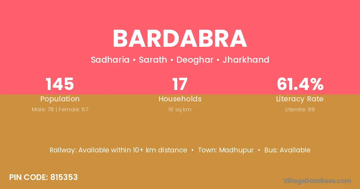 Bardabra village has a total population of 145 people, of which 78 are males and 67 are females.