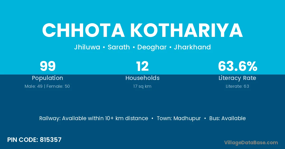 Chhota Kothariya village has a total population of 99 people, of which 49 are males and 50 are females.