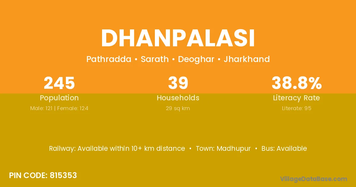 Dhanpalasi village has a total population of 245 people, of which 121 are males and 124 are females.