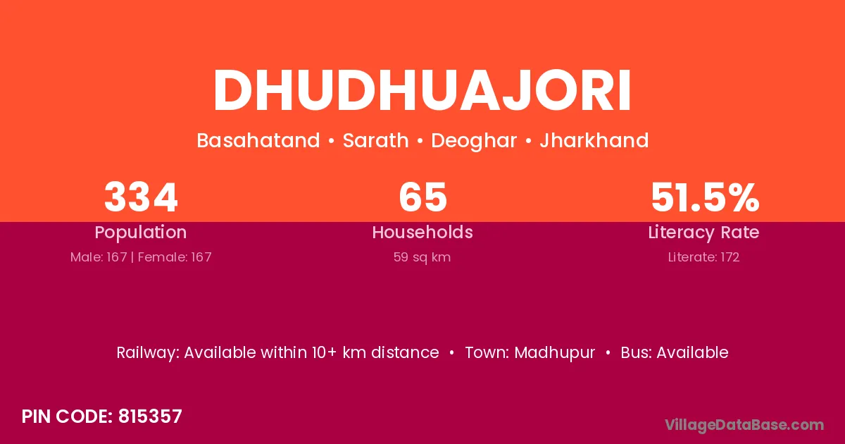 Dhudhuajori village has a total population of 334 people, of which 167 are males and 167 are females.