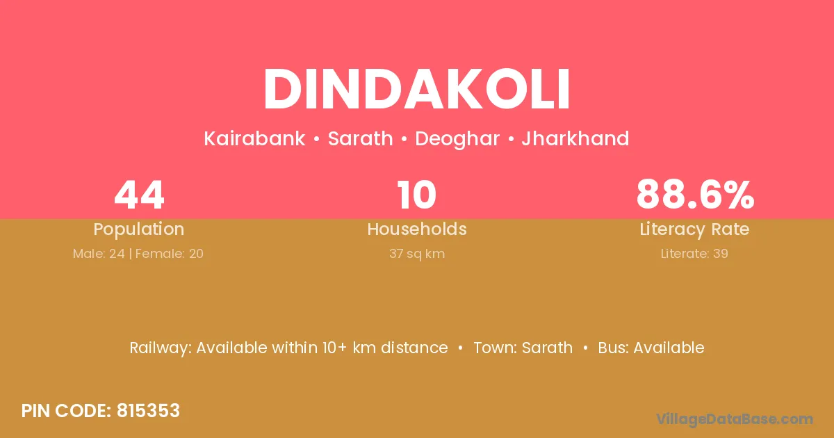 Dindakoli village has a total population of 44 people, of which 24 are males and 20 are females.