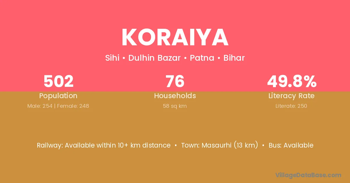 The literacy rate of Koraiya village is 51.52%. Male literacy stands at 64.71% and female literacy at 37.50%.