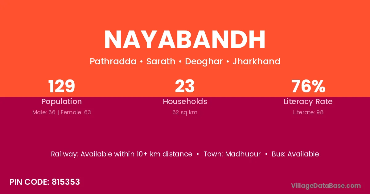 Nayabandh village has a total population of 129 people, of which 66 are males and 63 are females.