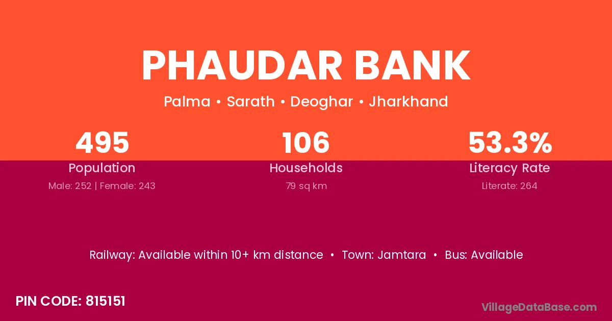 Phaudar Bank village has a total population of 495 people, of which 252 are males and 243 are females.