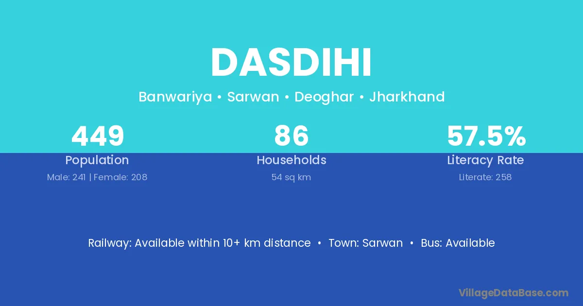 Dasdihi village has a total population of 449 people, of which 241 are males and 208 are females.