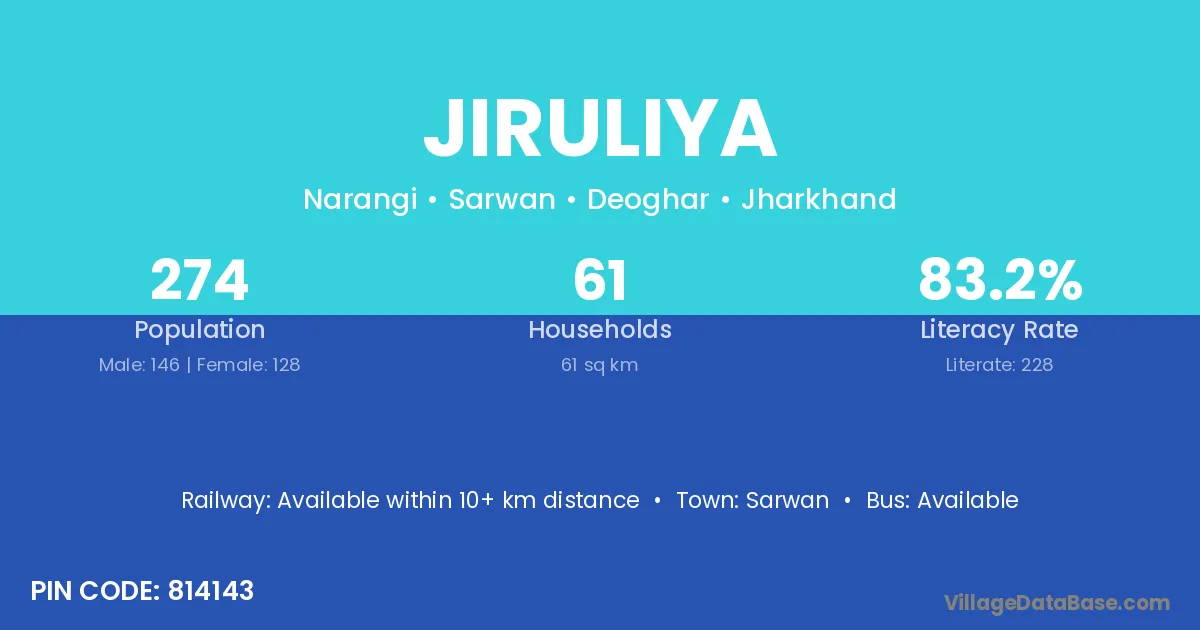 Jiruliya village has a total population of 274 people, of which 146 are males and 128 are females.