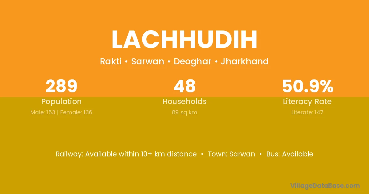 Lachhudih village has a total population of 289 people, of which 153 are males and 136 are females.