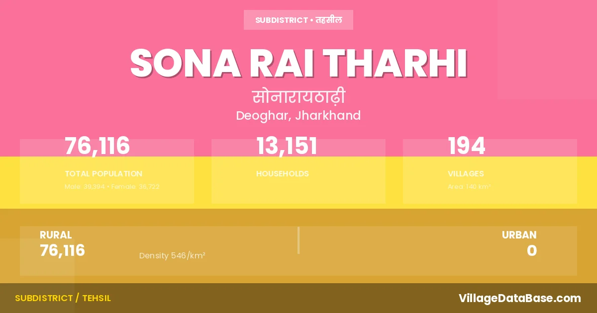 Sona Rai Tharhi is a town and Subdivision in the Deoghar district of the Jharkhand. In India, a Subdivision is a subdivision of a district responsible for the administration and revenue collection of a specific area within the district. Subdivisions play a crucial role in the local governance structure, contributing significantly to the development and administration of their communities.