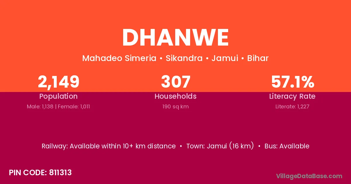 The literacy rate of Dhanwe village is 30.58%. Male literacy stands at 45.40% and female literacy at 13.73%.