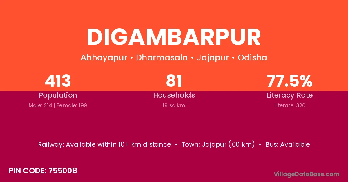 Digambarpur village has a total population of 108 people, of which 58 are males and 50 are females.