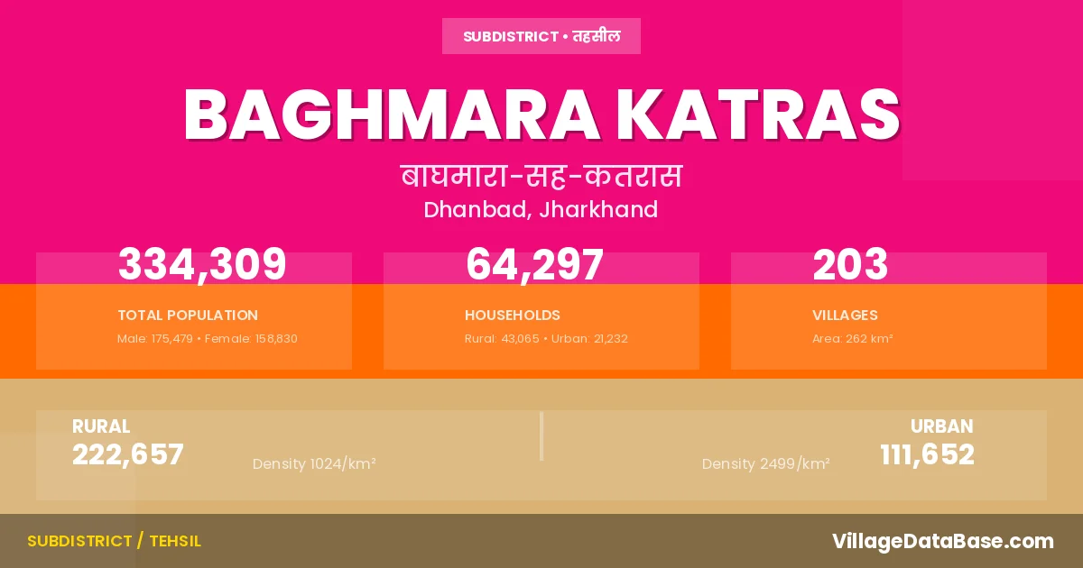 According to the 2011 census The total area of Baghmara Katras Subdivision is 262 km², with a population of 334309 people. The population density is 1,275 inhabitants per square kilometre, and there are approximately 64297 houses in the sub district.