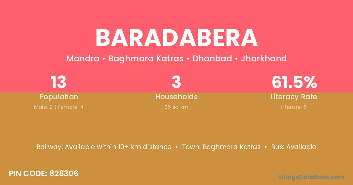 Baradabera village has a total population of 13 people, of which 9 are males and 4 are females.