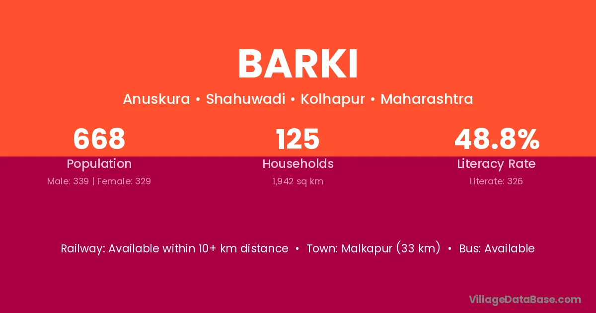 Barki village has a total population of 1,259 people, of which 663 are males and 596 are females.