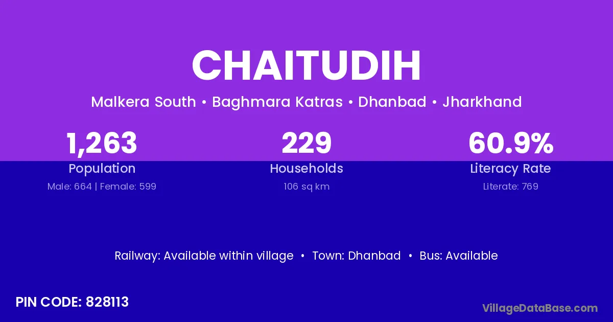 Chaitudih village has a total population of 1,263 people, of which 664 are males and 599 are females.