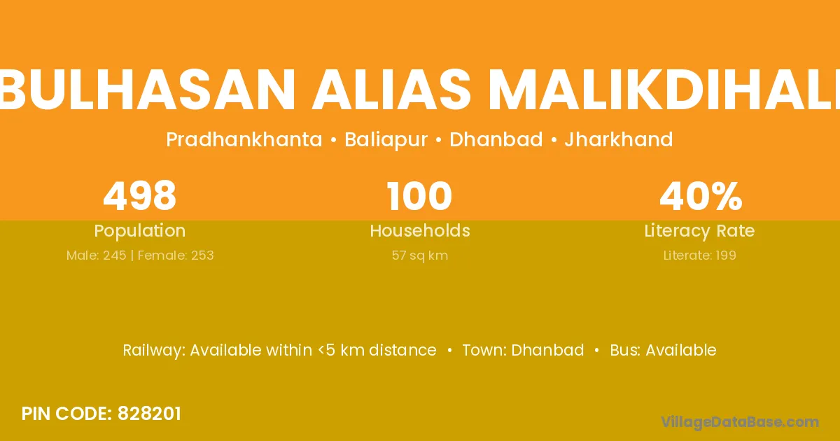 Abulhasan Alias Malikdihalia village has a total population of 498 people, of which 245 are males and 253 are females.