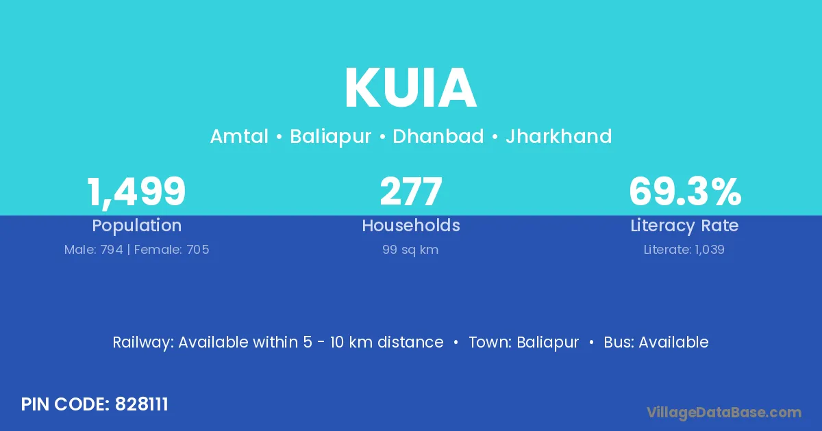 Kuia village has a total population of 1,499 people, of which 794 are males and 705 are females.