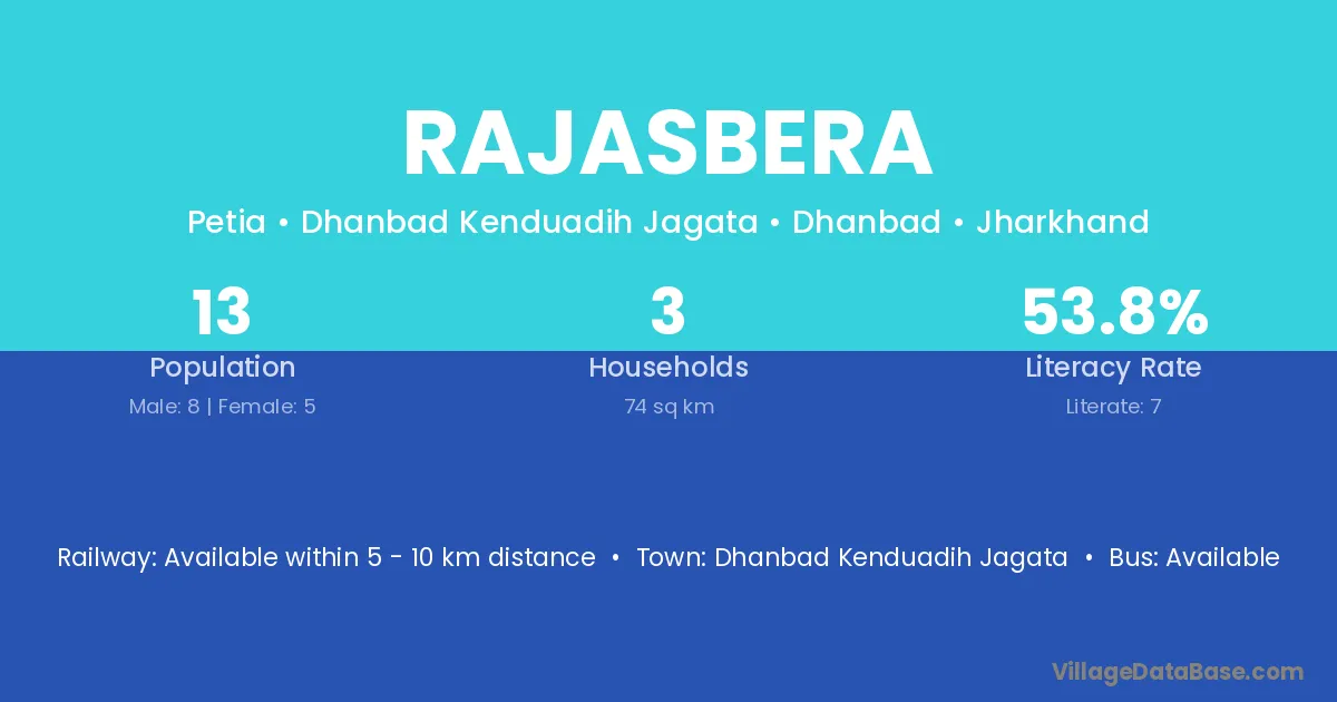 Dhanbad Kenduadih Jagata is the nearest town to Rajasbera village for major economic activities