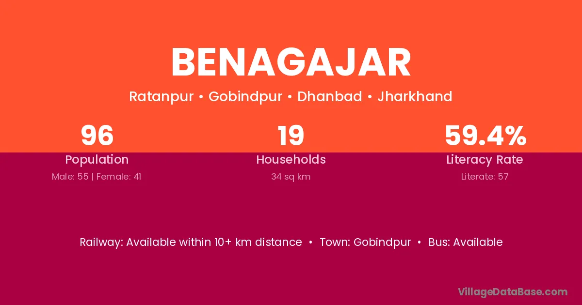 Benagajar village has a total population of 96 people, of which 55 are males and 41 are females.