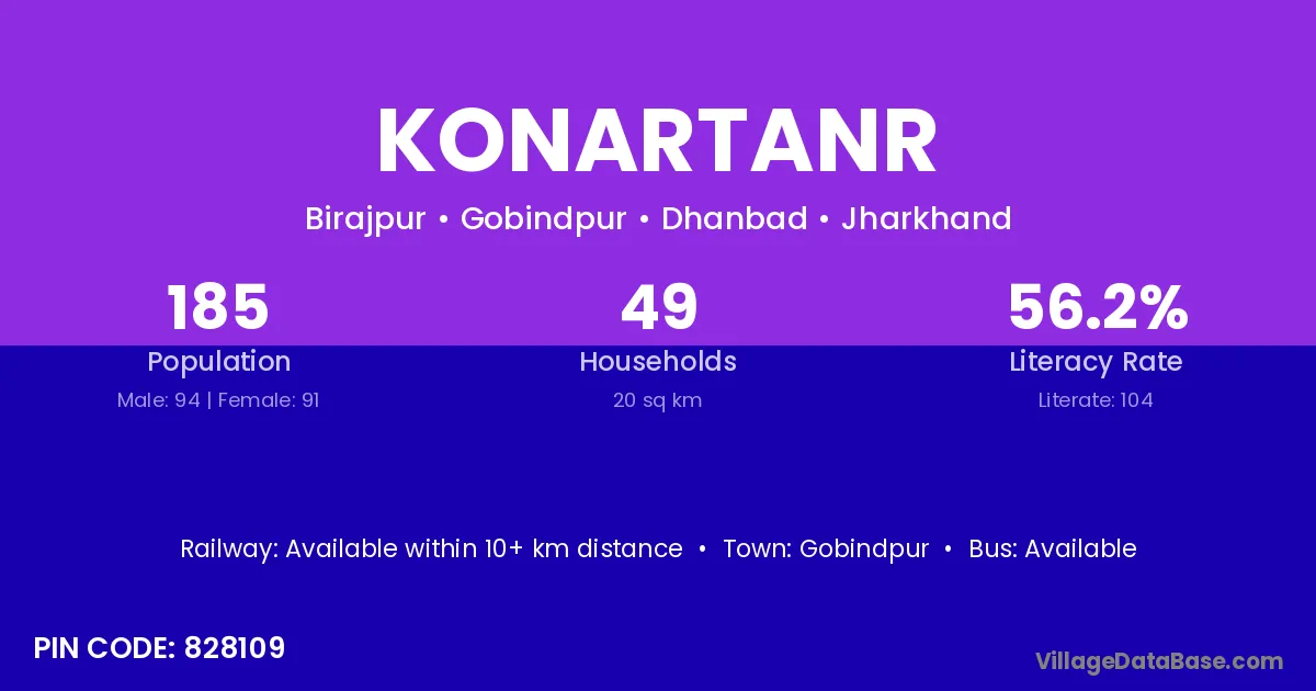 Konartanr village has a total population of 185 people, of which 94 are males and 91 are females.
