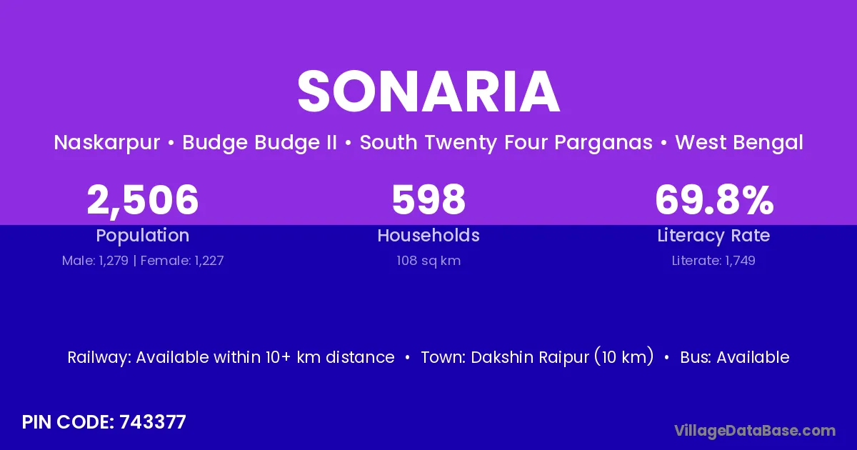 The literacy rate of Sonaria village is 46.52%. Male literacy stands at 59.21% and female literacy at 32.56%.