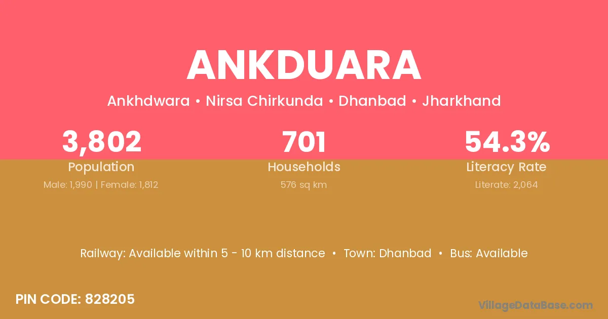 Ankduara village has a total population of 3,802 people, of which 1,990 are males and 1,812 are females.