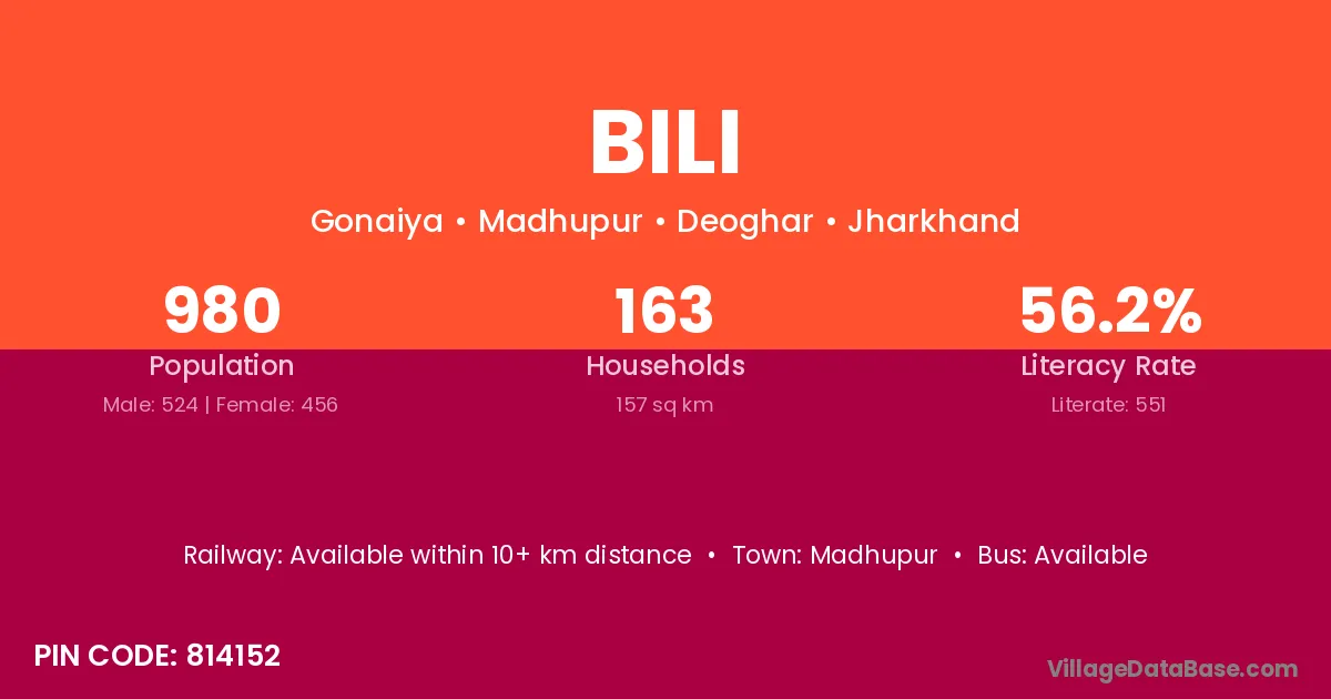 Bili village has a total population of 1,140 people, of which 578 are males and 562 are females.
