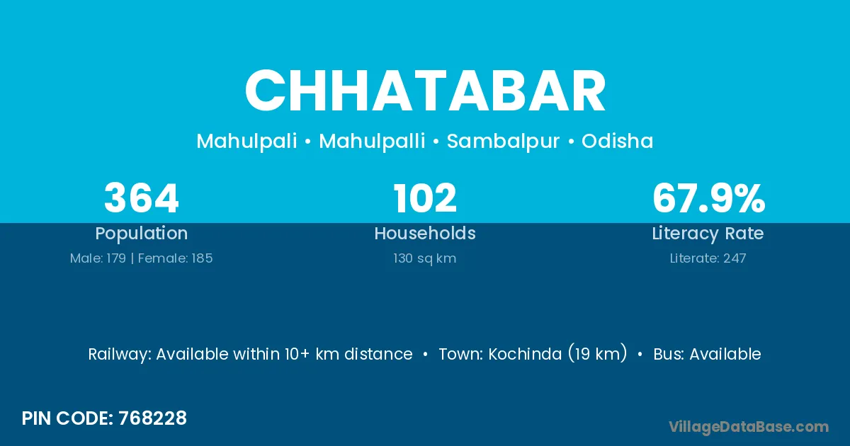 Chhatabar village has a total population of 178 people, of which 100 are males and 78 are females.