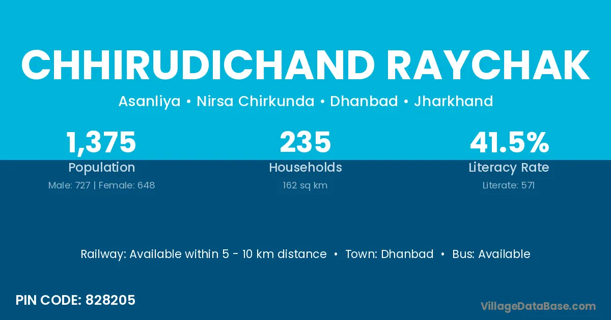 Dhanbad is the nearest town to Chhirudichand Raychak village for major economic activities