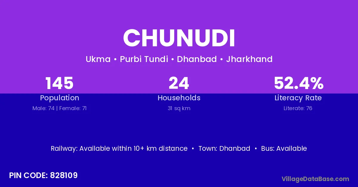 Dhanbad is the nearest town to Chunudi village for major economic activities