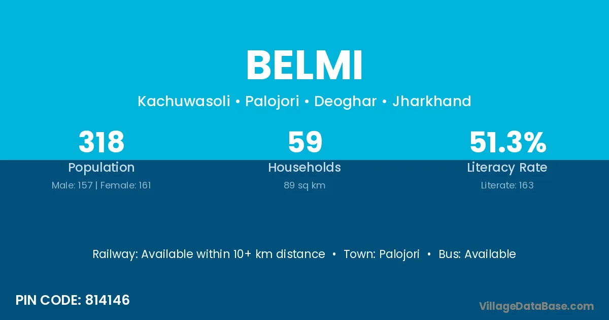 The literacy rate of Belmi village is 57.29%. Male literacy stands at 67.83% and female literacy at 45.74%.