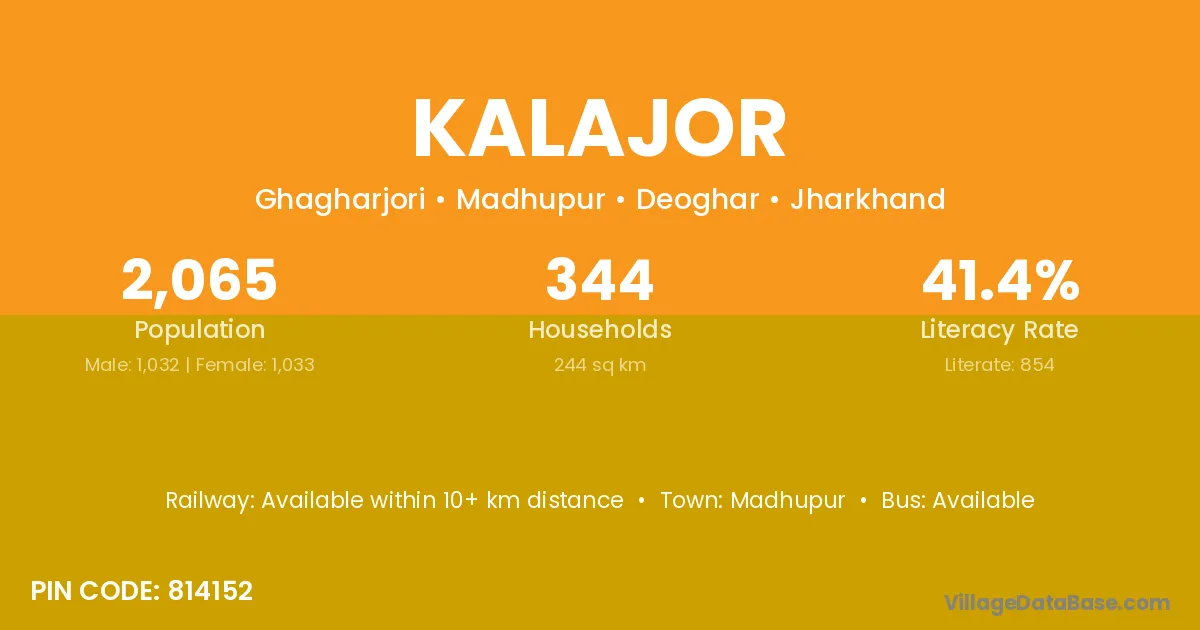 The literacy rate of Kalajor village is 65.55%. Male literacy stands at 63.79% and female literacy at 67.21%.