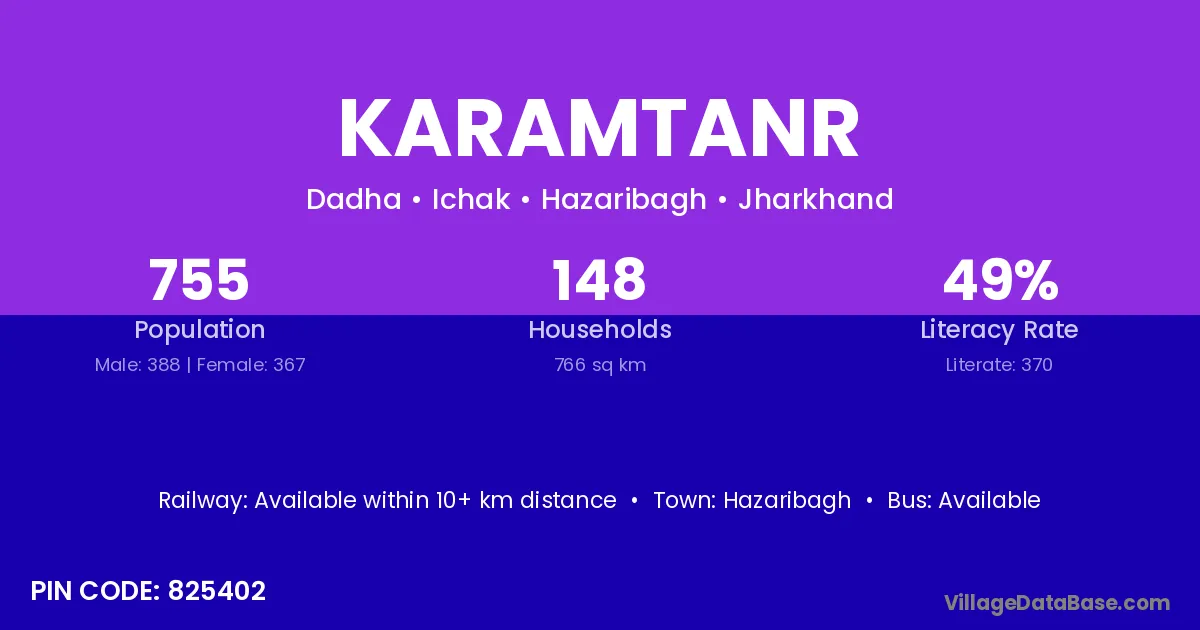 The literacy rate of Karamtanr village is 63.41%. Male literacy stands at 71.54% and female literacy at 53.85%.