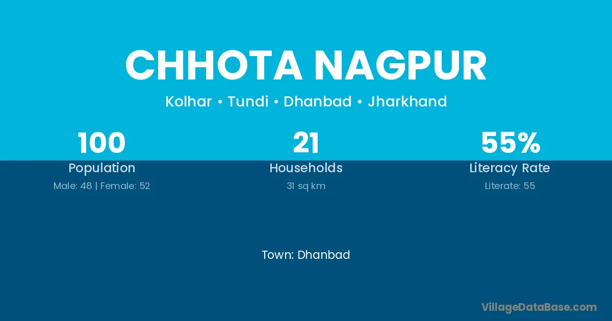 The literacy rate of Chhota Nagpur village is 55.00%. Male literacy stands at 62.50% and female literacy at 48.08%.