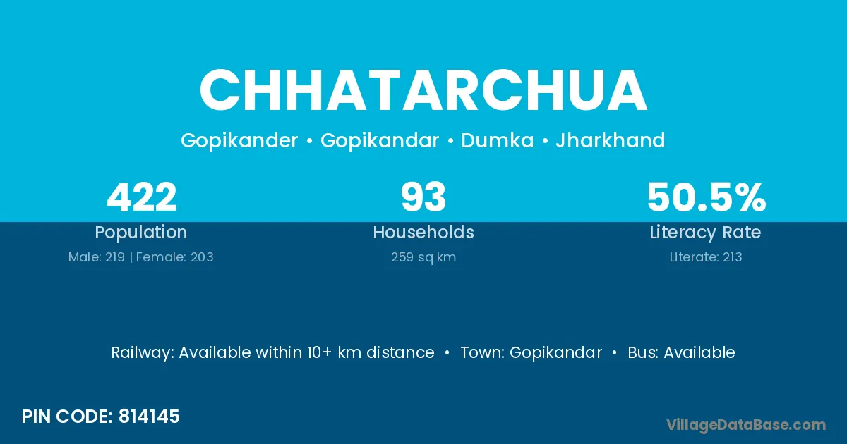 Chhatarchua village has a total population of 422 people, of which 219 are males and 203 are females.