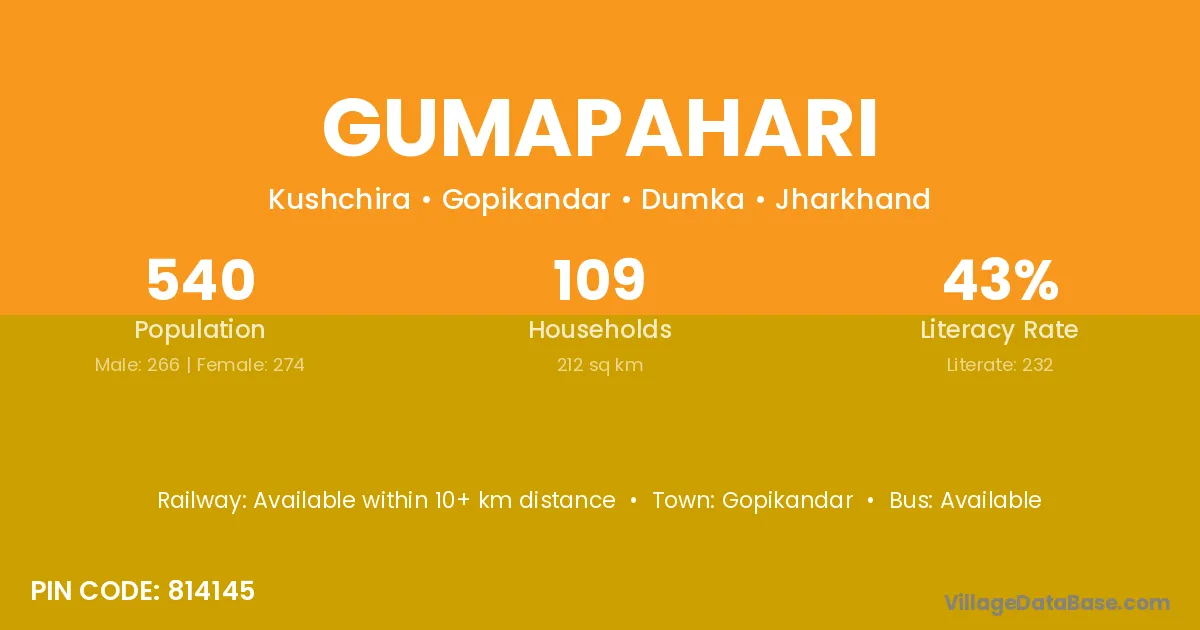 Gumapahari village has a total population of 540 people, of which 266 are males and 274 are females.