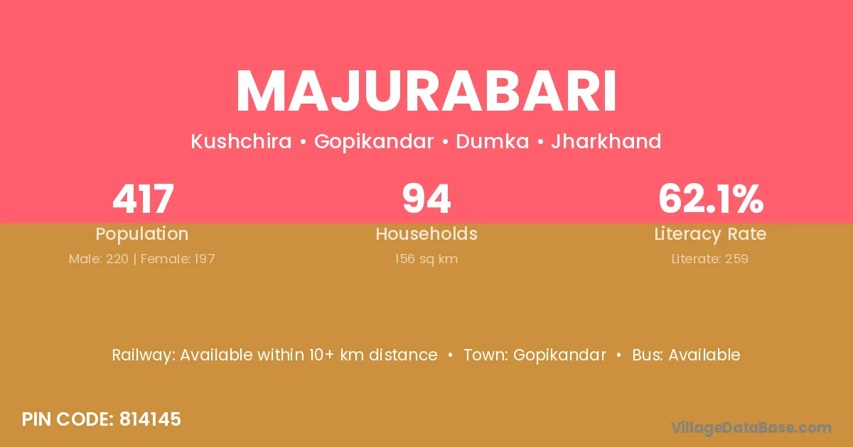 Majurabari village has a total population of 417 people, of which 220 are males and 197 are females.