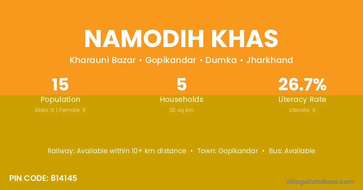 Namodih Khas village has a total population of 15 people, of which 6 are males and 9 are females.